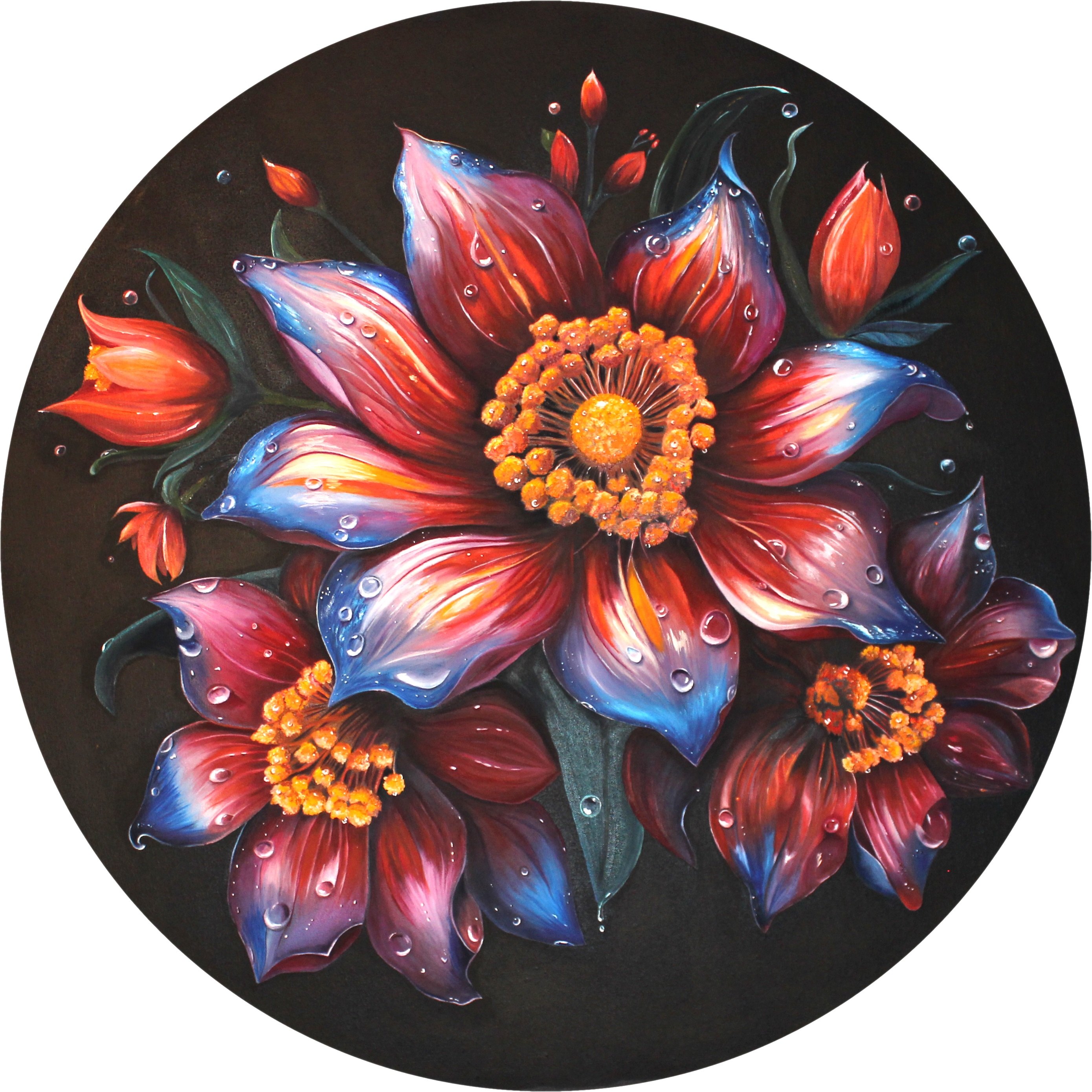 Картина словно оживает перед глазами, погружая зрителя в мир ярких красок и загадочной красоты. В центре композиции — огненный цветок, лепестки которого переливаются оттенками красного, синего и фиолетового, словно языки пламени, отражающиеся в воде. Его сердцевина, золотисто-оранжевая, напоминает солнце, окружённое каплями росы, которые блестят, как драгоценные камни. Вокруг главного цветка распускаются бутоны, их лепестки ещё не раскрылись, но уже обещают стать продолжением этого яркого праздника природы. Тёмный фон усиливает контраст, делая цвета ещё более насыщенными и глубокими. Картина вызывает ощущение тепла, энергии и гармонии, словно природа сама решила показать свою красоту в этом удивительном творении. Год - 2025 Размер, см - 100*100 Техника исполнения - Масло Направление - декоративный реализм с элементами импрессионизма