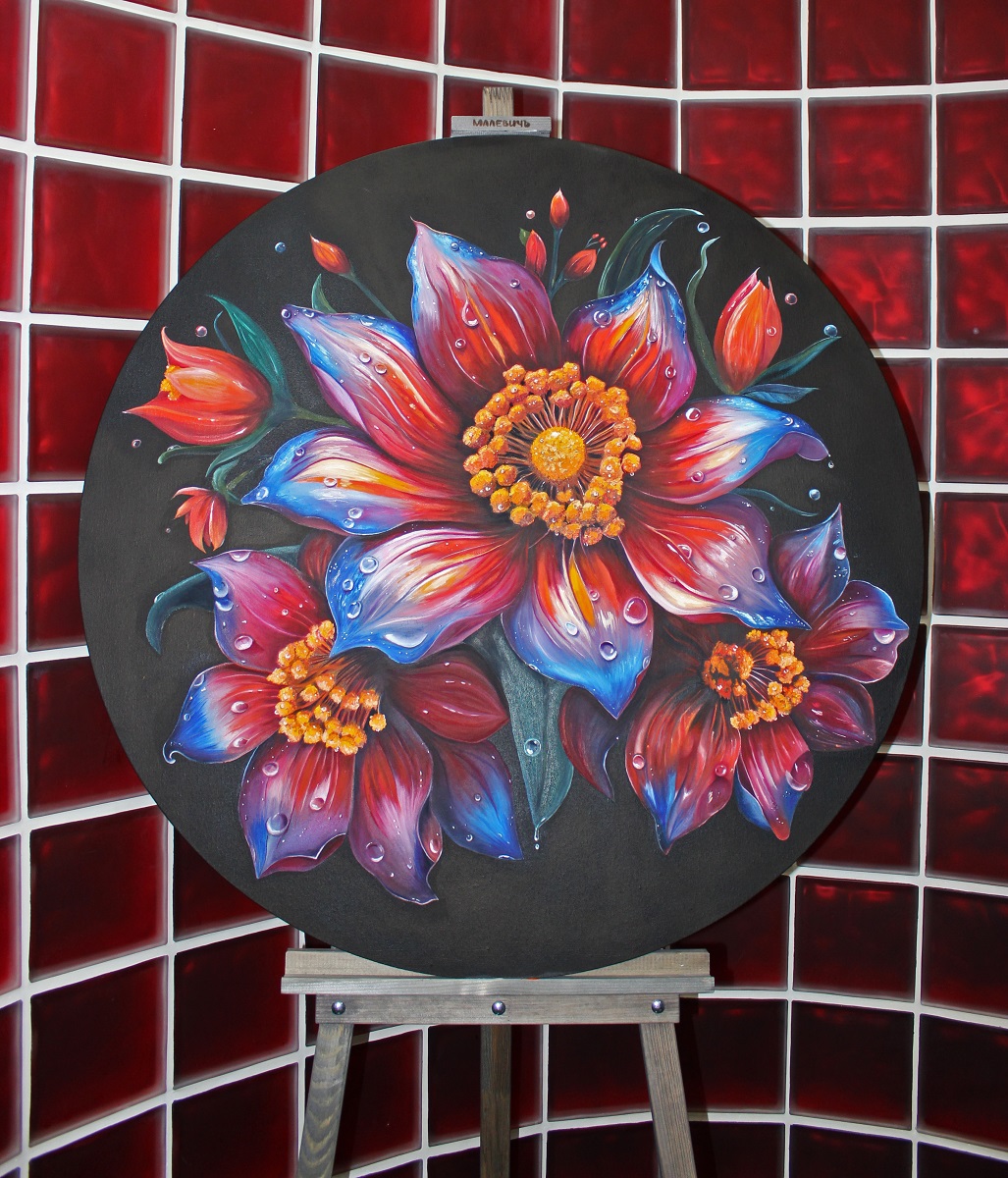 Картина словно оживает перед глазами, погружая зрителя в мир ярких красок и загадочной красоты. В центре композиции — огненный цветок, лепестки которого переливаются оттенками красного, синего и фиолетового, словно языки пламени, отражающиеся в воде. Его сердцевина, золотисто-оранжевая, напоминает солнце, окружённое каплями росы, которые блестят, как драгоценные камни. Вокруг главного цветка распускаются бутоны, их лепестки ещё не раскрылись, но уже обещают стать продолжением этого яркого праздника природы. Тёмный фон усиливает контраст, делая цвета ещё более насыщенными и глубокими. Картина вызывает ощущение тепла, энергии и гармонии, словно природа сама решила показать свою красоту в этом удивительном творении. Год - 2025 Размер, см - 100*100 Техника исполнения - Масло Направление - декоративный реализм с элементами импрессионизма