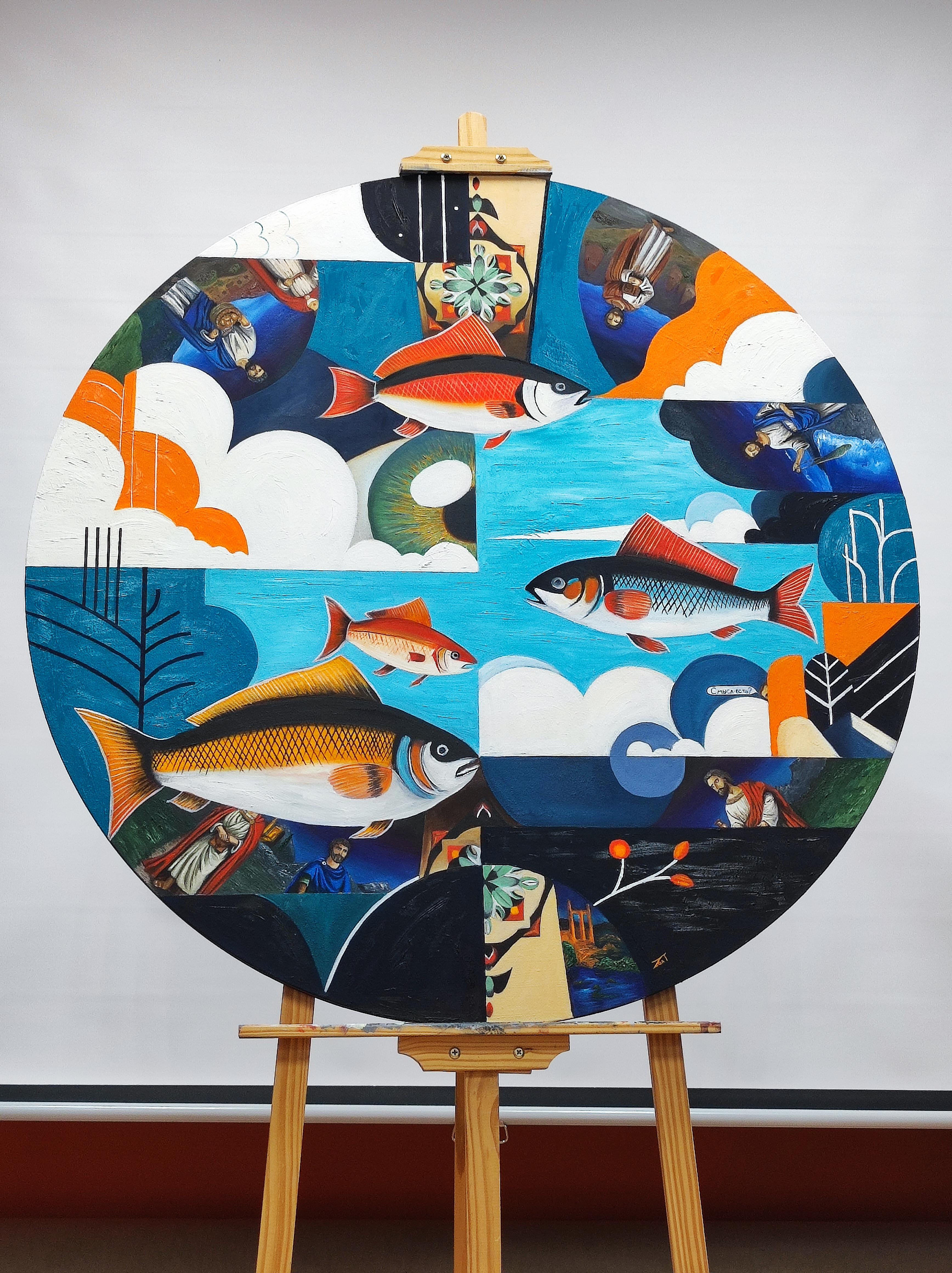 Произведение представляет собой яркий и многослойный коллаж в круглой композиции, сочетающий элементы природы, библейской иконографии и абстрактного искусства. Картина производит впечатление синтеза времён и культур: здесь сочетаются древние образы и современный художественный язык. Она может интерпретироваться как размышление о единстве мира, цикличности жизни и взаимосвязи всего сущего. Работа притягивает взгляд своей динамикой, гармонией и загадочностью, побуждая зрителя к собственным ассоциациям и открытиям. Год - 2025 Размер, см - 100*100 Техника исполнения - Масло Направление - символизм